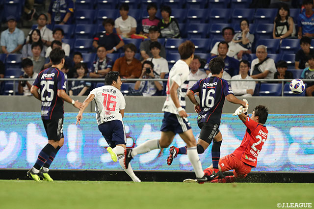 巧みなループシュートを放ち ゴールに流し込んだ伊藤 翔 横浜fm 16 前半のうちに2ゴールを奪取 ルヴァンカップ 準々決勝 第1戦 g大阪vs横浜fm jリーグ Jp