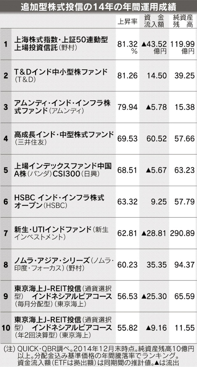 14年の年間運用成績 中国 インド株ファンド上昇 日本経済新聞